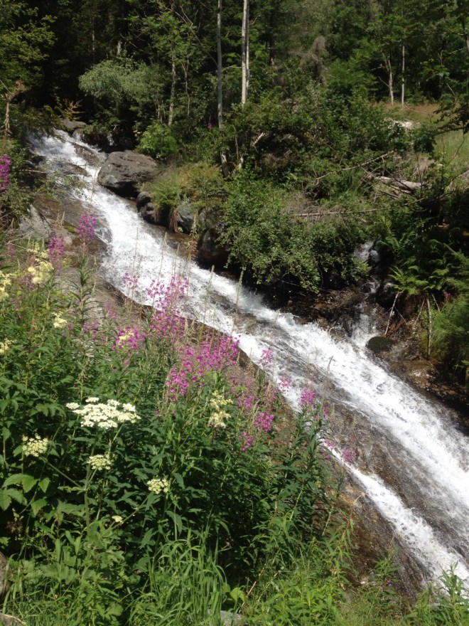 The climb up to the Croix de Fer starts with the Glandon ascent for those who know the Marmotte but then goes right when approaching the top, not left. This is officially a 30km climb though the lower slopes are fairly easy. I took the opportunity to take photos of what I always remember from this climb, namely the many waterfalls that provide welcome relief from the heat.