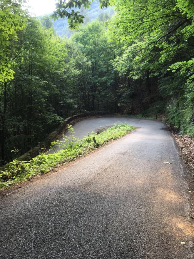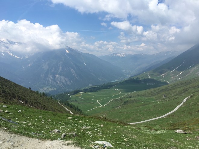 Thankfully the descent off Finestre towards Sestriere is a proper road surface. The road is wide enough for a car to pass a cyclist but not much else, so it’s fairly tight. Again, this shows the skill of the professional riders, being able to control their bikes at such speed on narrowish roads which fall away steeply.