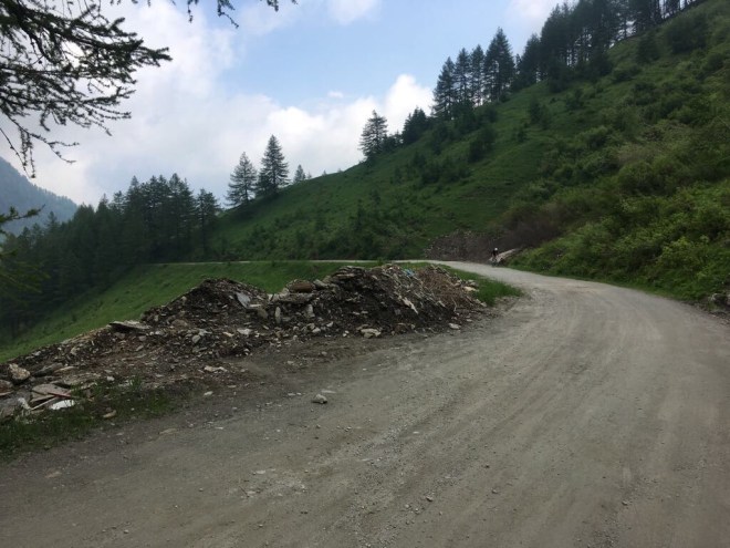 On the way up we passed Ben and Ying coming down to Susa where they had left the car. I didn’t envy them having to descend on that gravel – the road surface was unpaved, hard packed earth with plenty of loose gravel so you had to pick your lines carefully. Sometimes you could feel the wheels sticking a little on the damper sections, though we were blessed with a dry day, but there had been some overnight rain in the area.