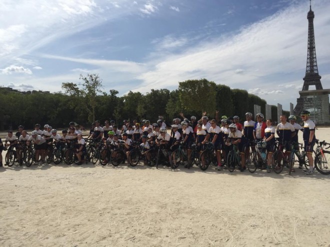 We hung around until all the riders made it to the Eiffel Tower and there was quite a throng of family and friends there to meet them. Then of course it was time for the obligatory group photo.