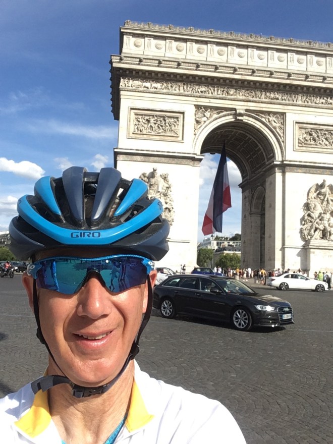 Cycle lanes have been installed on the Champs which made that circuit far less harrowing than it could have been (though the Arc de Triomphe roundabout is always a special challenge). So, down the Champs, under the tunnel and back up past the official finish line before getting to the hotel.