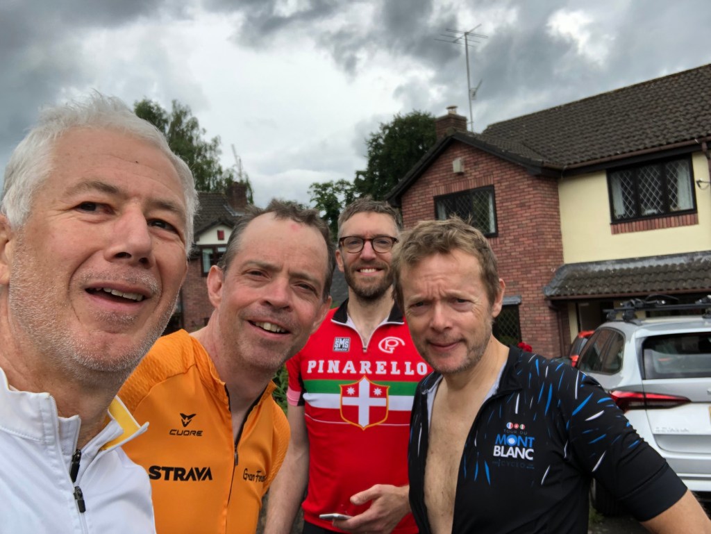 Went the long way round up some wonderful climbs, past lakes and reservoirs, kites flying low overhead and many cattle grids to negotiate. Finished off with a pint at the end, just as the heavens opened. Jackets on and off all day but overall ok. Weather looks good for the long ride back to Abergavenny tomorrow. Saved a lot of money by staying with John’s family, so I’ll be contributing that to the William Wates Memorial Trust instead.