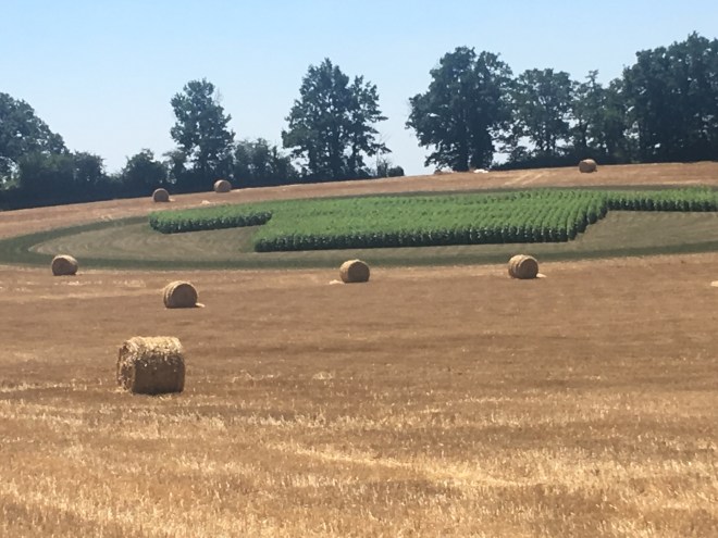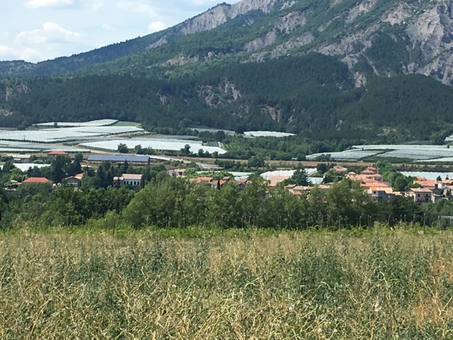 Another lovely ride today, as we crossed from Provence to the Haute Alpes region. The scenery varied from lavender fields to craggy rocks to orchards. The orchards are mostly covered with nets, so that it seemed to me like they formed a sea, or at least a series of lakes.