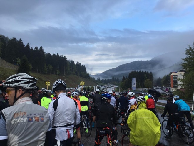 Originally the plan was that we would just go for another ride in the area, but after we had decided to stay in La Bresse we found that there was a sportive event taking place on the Sunday, starting and finishing in La Bresse Hohneck, just 10 km away from us. We all decided to do this and had signed up for the Granfondo (176km, 3,600 metres climbing), though there was talk of some possibly switching to the Mediofondo (122km, 2,700 metres climbing). The forecast wasn’t great, with the threat of rain and even possibly thunder throughout the day. In the event, after a damp and misty start I just caught a few brief showers, but nothing significant.