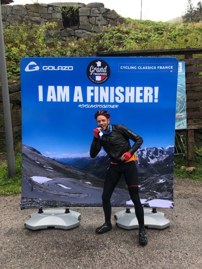 I was just emptying the tank now. I had scoffed more gels and jelly sweets than I had ever before and it took quite a while before I realised that I was still powering along in the big ring rather than having switched down to the smaller ring and spinning up. OK, so the gradient wasn’t so steep for the most part but this was still a big, sustained effort. Feeling a need to pee. No time for that – I can wait a few more minutes. Flying past others who were slowly grinding their way up. I just wasn’t tired and had felt good all day. Maybe that was the adrenalin that I’m feeling again now as I write, because I was both tired and buzzing at the same time later that evening. Two inflatable arches come into view. Which one do I need? I hope the end isn’t going to be complicated. The route has been well signposted all day, but do I aim for the farther red one, which is where we started? Or the closer, less obtrusive and smaller pale green one that was just past the roundabout that I was now approaching? It was the green one! Great, seconds saved, and with a final surge past another rider I was over the timing mats to finish. Time now 16:04. That’s enough isn’t it? I’ve done it, no? Yes!! I had stopped the clock at 7h57! To cap it all, I had done that last climb in 14:32, more than a minute quicker than yesterday morning. Proper chuffed.