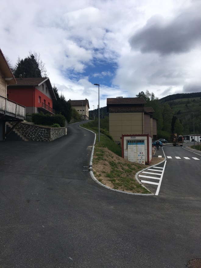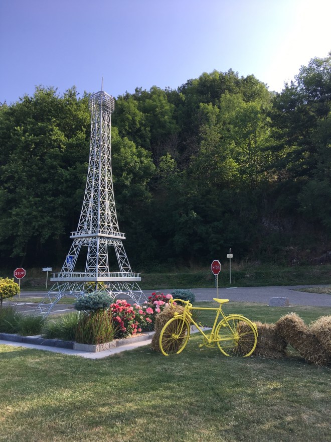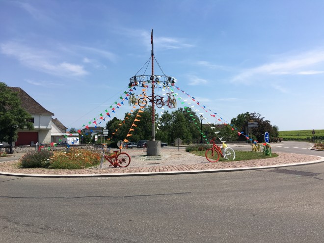 Wonderful day of typically beautiful Vosges scenery. In the villages again witnessing the preparations being made for the pro Tour next week. Where do all the bicycles come from that are painted in the Tour colours of yellow, green, white and red polka dot?