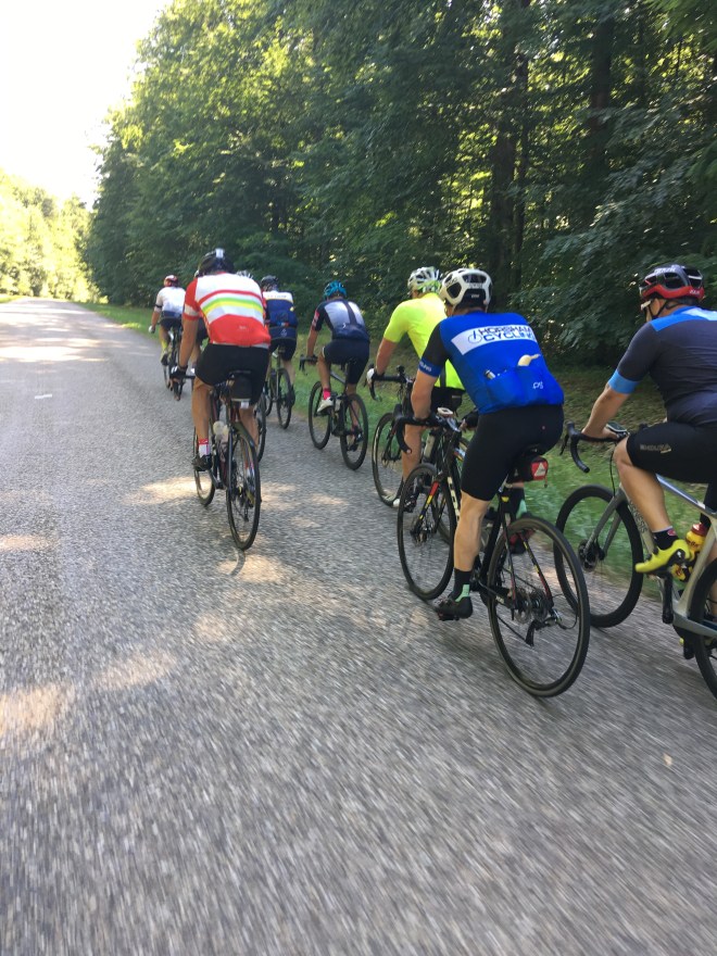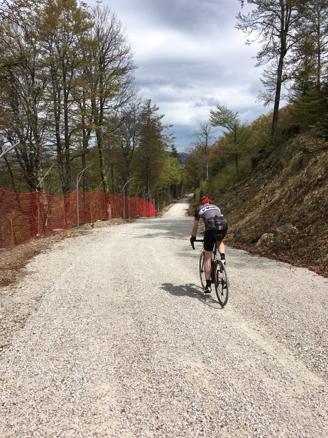 Mixture of group riding on the busy roads to near-solo efforts on the descents and climbs – losing too much time on descents to then climb with the group, but happy to be in the zone and finally going up some longer climbs. Two Cat 2s today, both about 6% gradient. Finding that rhythm that I really enjoy. Almost clawing back the gap to the group by the last feedstop, to lose it again on the next descent.