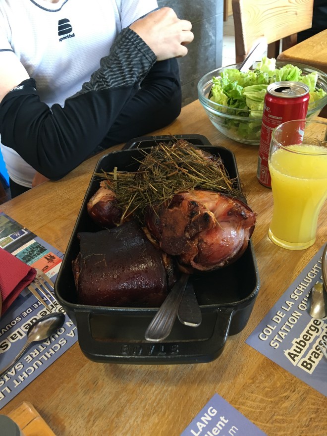 Ben had plotted a route for us that was much more of a holiday ride than the day before, though it was still 103km with 2,100 metres of climbing. After climbing out of La Bresse we had a long long descent into Munster (18 km). Feeling very German here, and that’s the language we heard most at our cafe stop. Well, this area has changed hands a few times in the past and that is also evident from some of the place names and the architecture. Climbing back out through Stosswihr (see?) and we ended up deviating from our intended route and ended up at the top of Col du Wettstein (see again?) and then on to Linge. Back down to our original route before climbing up to Orbey. The final climb of the day was up to Col du Calvaire and then there was a fantastic undulating plateau for about 12km where I was feeling really strong, especially compared with my sluggish start to the day pre-coffee in Munster.