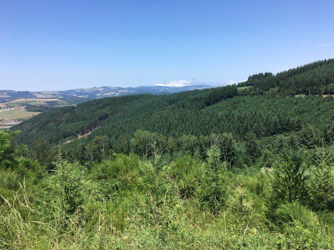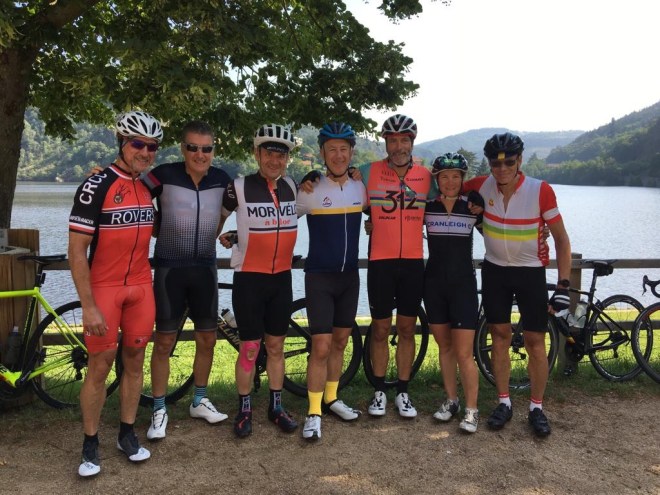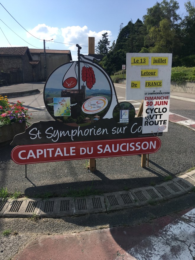 The main climb of the day was the Mur d’Aurec sur Loire, a Cat 1 that we climbed just after the first feedstop. Only about 3km but very steep, as the name suggests. The roadside marker claimed the average gradient for the last 200 metres was 12%, but I never saw less than 15%, so that was a lie! We regrouped at the top before continuing together, as much of the rest of the day was more rolling and it’s great to ride as a group.