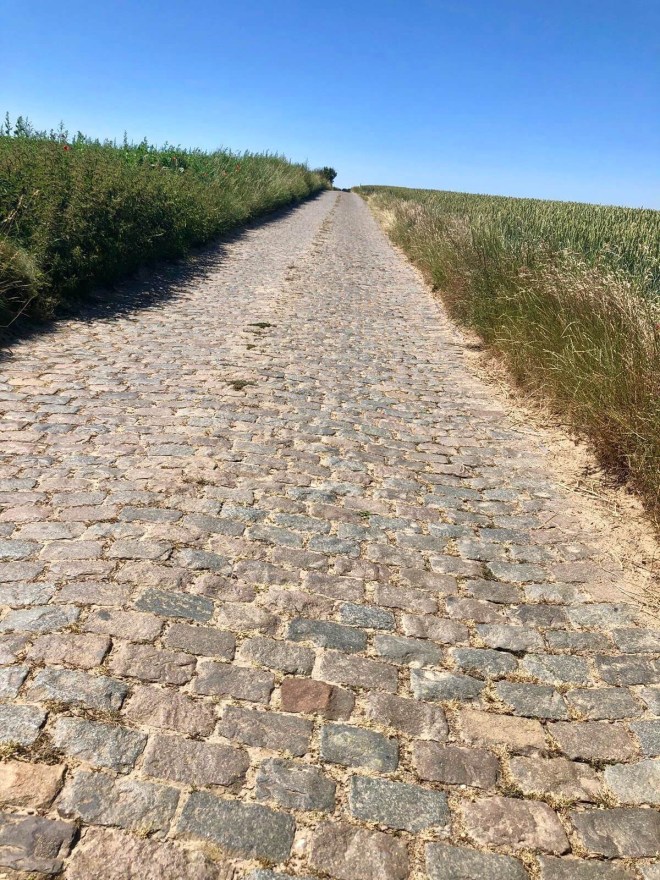 Meanwhile of course we have done some cobbles. Not just the 1.9km mentioned in the roadbook (plus the two climbs), but six or seven “bonus” sections as well. I think maybe they don’t count if they are less than 1km in length, but taken together they at least doubled the anticipated amount of cobbles! But we are in Belgium after all, so that’s to be expected along with farm tracks and concrete roads. Occasionally some nice tarmac was welcome though!