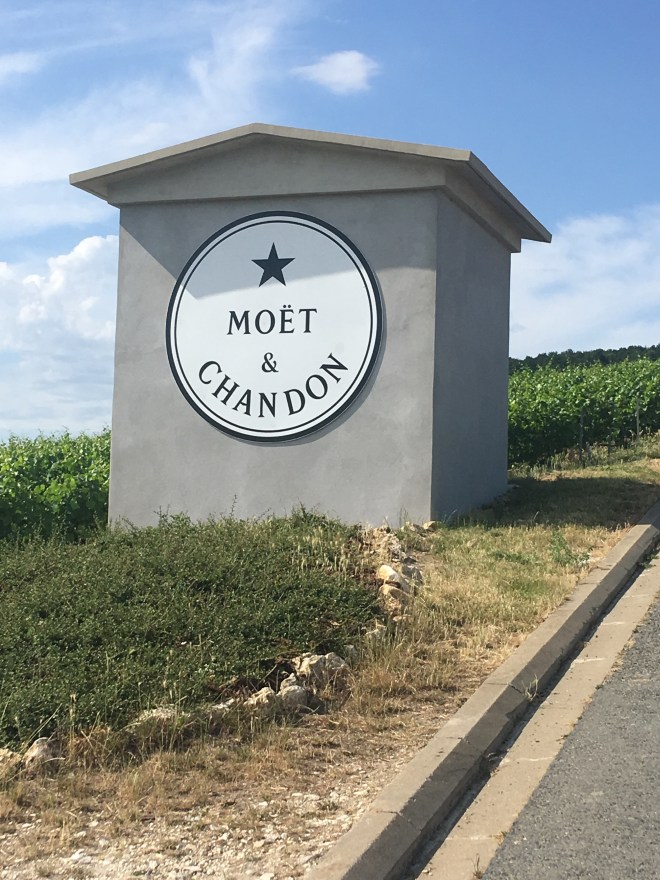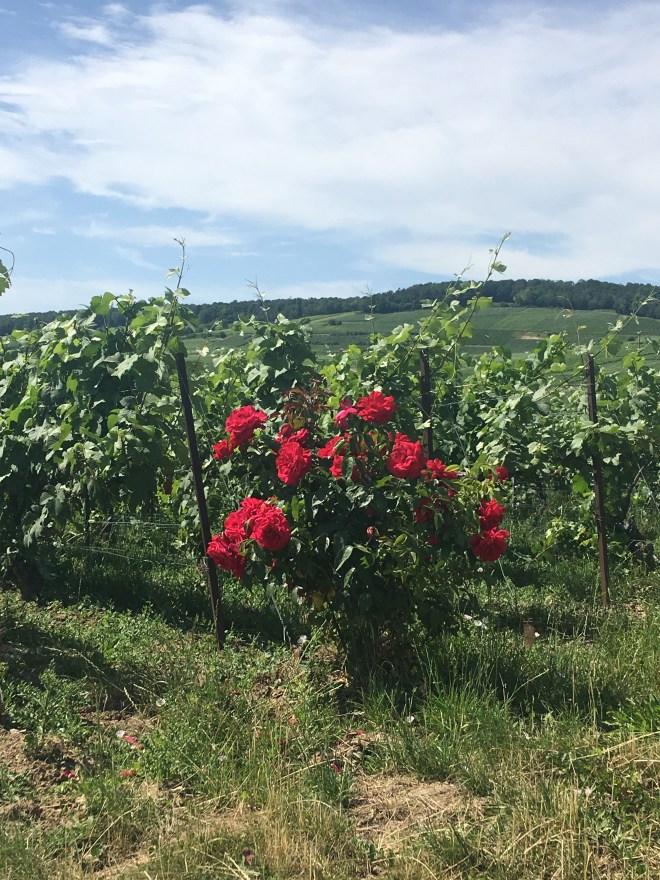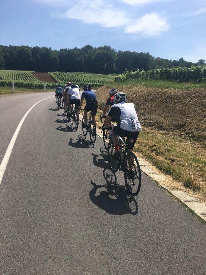 Indeed, the poppy-ribboned wheat fields in the morning gave way to champagne vineyards peppered with roses along the way. Such stunning scenery, such a good group and this is now possibly vying as one of my top 10 rides, though I probably already have 20 top ten rides, such has been my good fortune over recent years. The fields were also strewn with wind turbines which tells you what it is like around here. The Tour organisers are hoping for a lot of cross-winds which would make racing interesting, however today was not too bad. Though there were some gusts that moved you sideways, there was nothing serious.